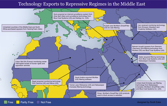 Nearly three years ago, Nokia Siemens was reported to have sold a sophisticated internet monitoring system to Iran. Since then, news of many other technology sales to repressive regimes has emerged. Most of the autocratic states in the Middle East -- those rated Not Free in Freedom House's Freedom in the World report -- have received U.S. or European technology to censor internet content or monitor online communications.
