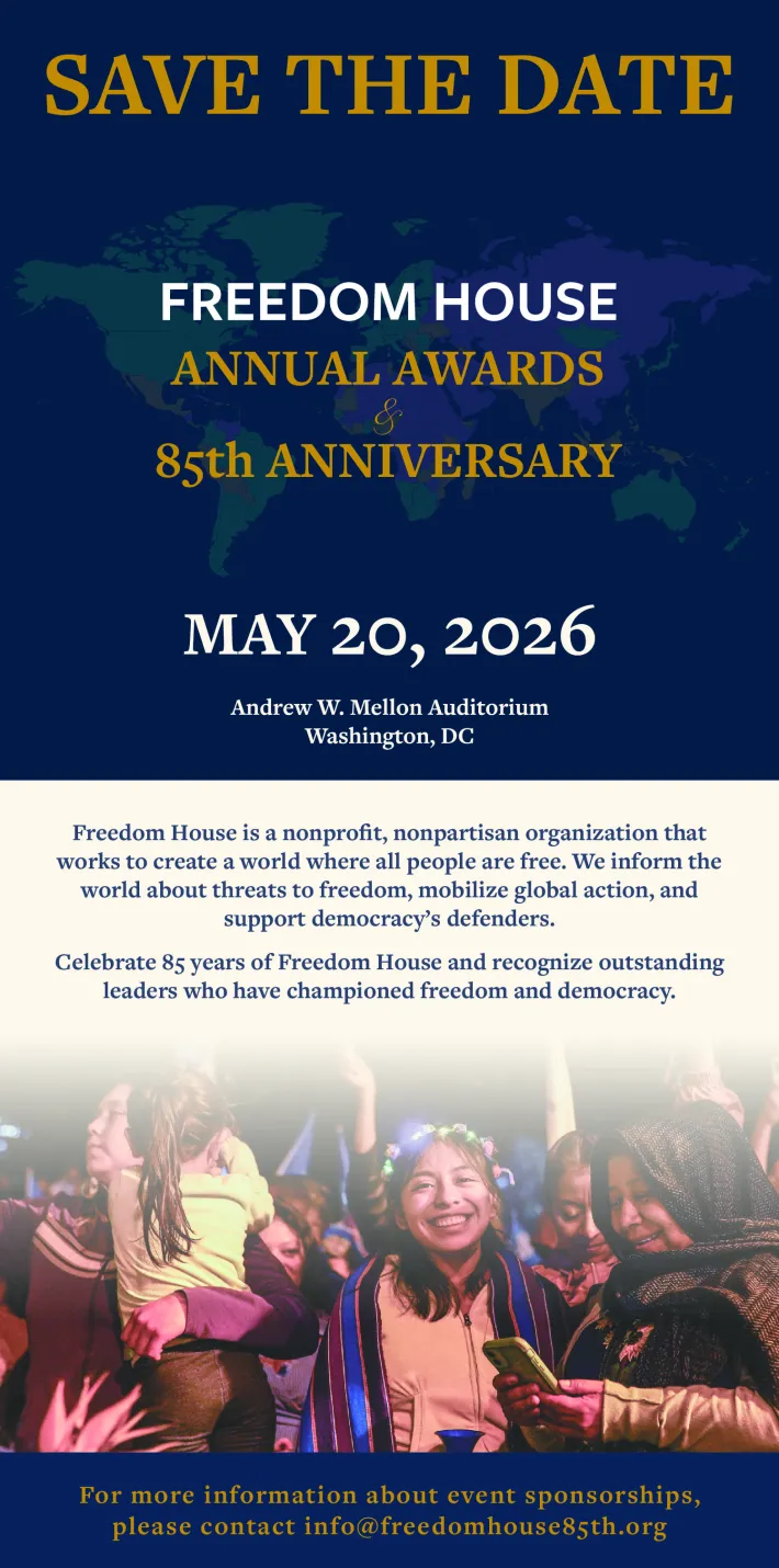 Freedom House is pleased to announce that the 2026 Freedom House Annual Awards will be held on Wednesday, May 20, 2026. As Freedom House marks its 85th anniversary this year, we invite you to join us in celebrating this milestone and honoring outstanding leaders who have demonstrated an enduring commitment to advancing freedom and democracy.